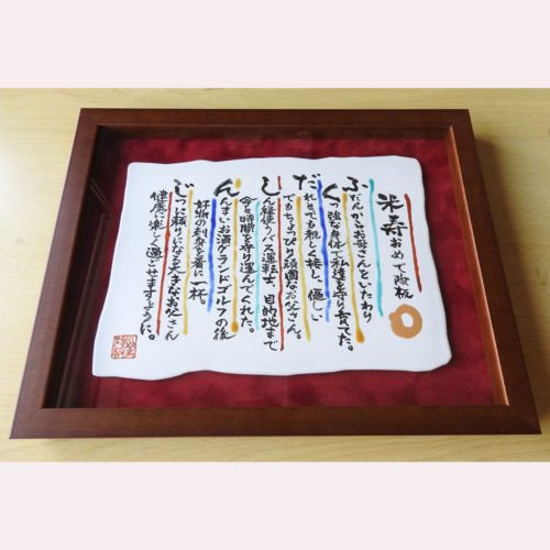 還暦や誕生日などのお祝いに感謝の気持ちをお伝えしませんか。九谷焼陶板でお名前の頭文字取りの詩にしてお手伝いします。