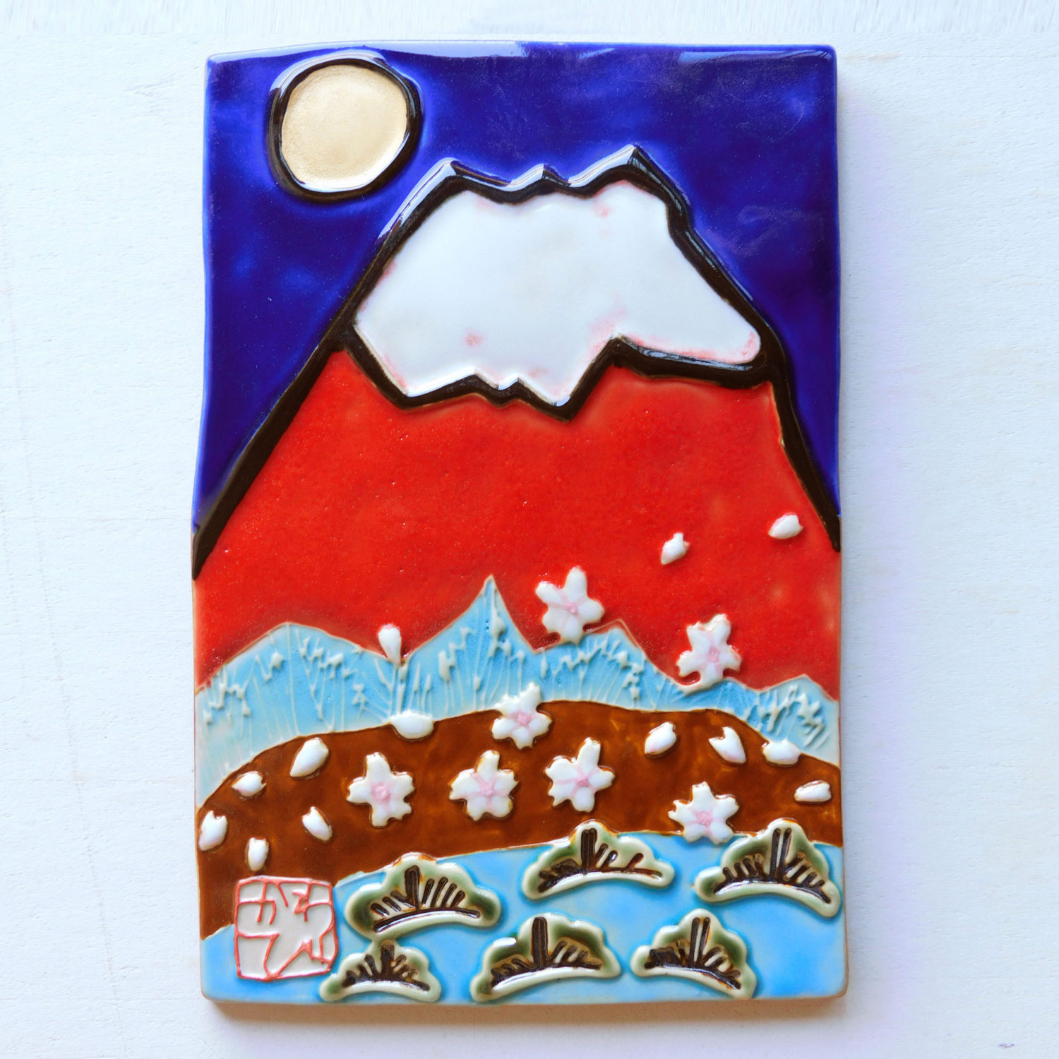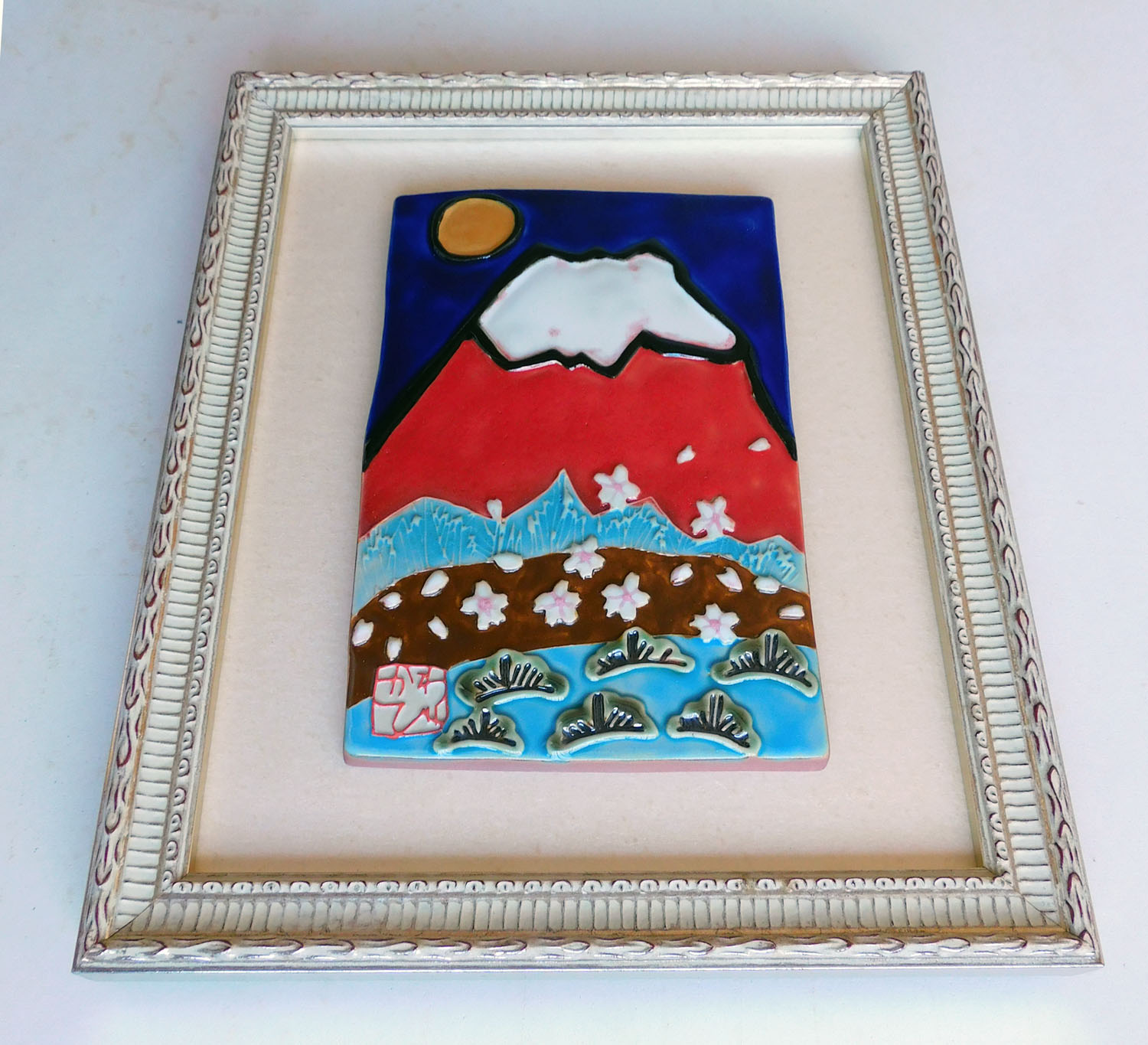 縁起物として、玄関やお部屋に飾り、家族の健康と繁栄をもたらすといわれる赤富士を陶板画に焼きあげました。