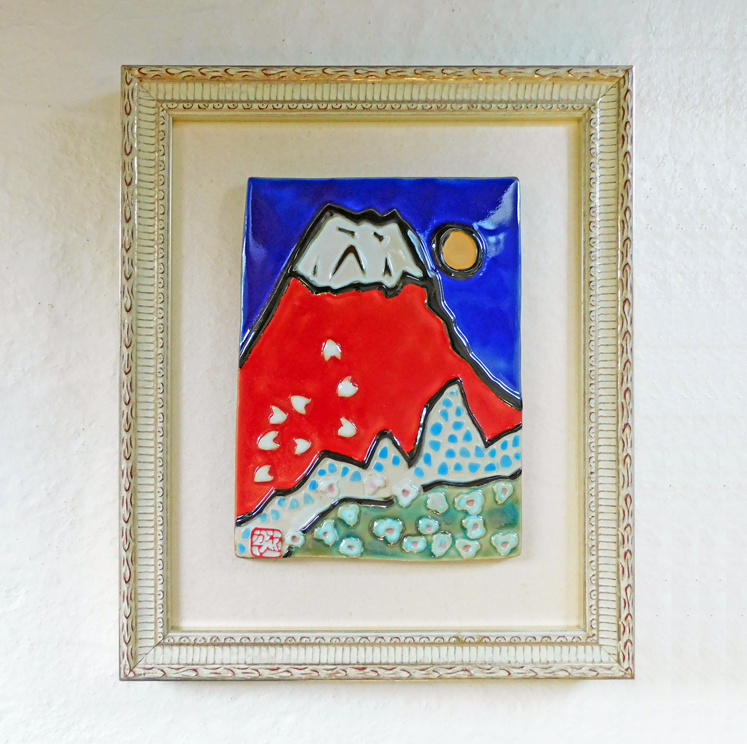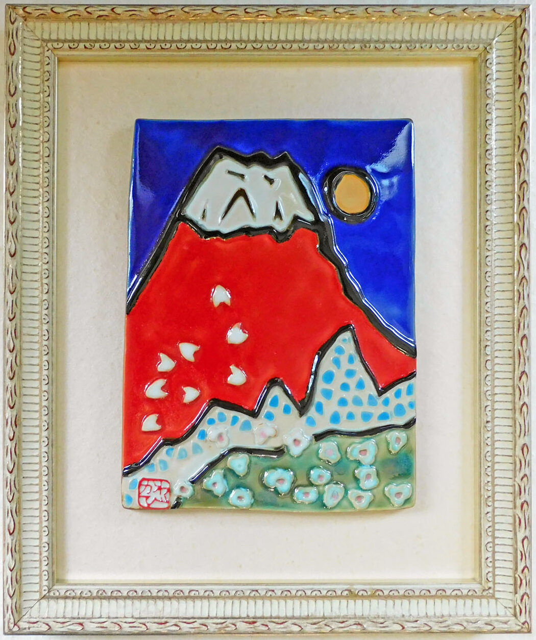 縁起物として、玄関やお部屋に飾り、家族の健康と繁栄をもたらすといわれる赤富士を陶板画に焼きあげました。