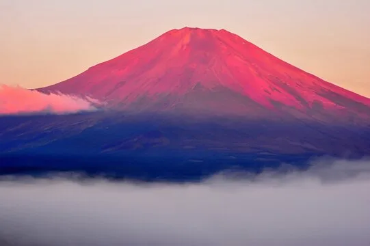 通常は青っぽく見える富士山ですが、晩夏から初秋にかけての朝早くに、雲や霧と朝陽との関係から富士山が赤く染まって見えることがあります。