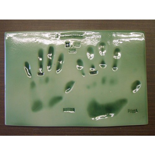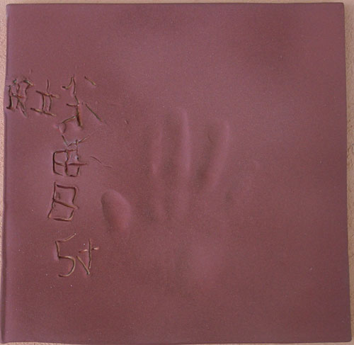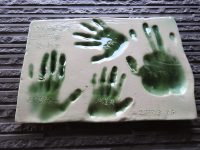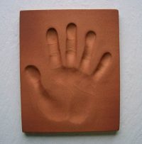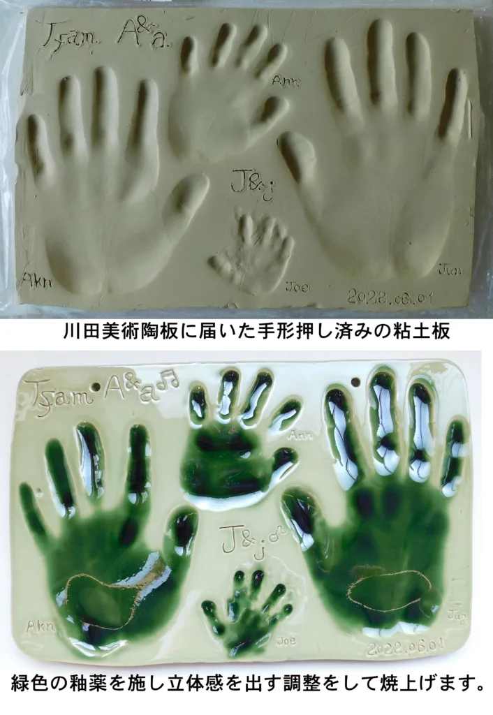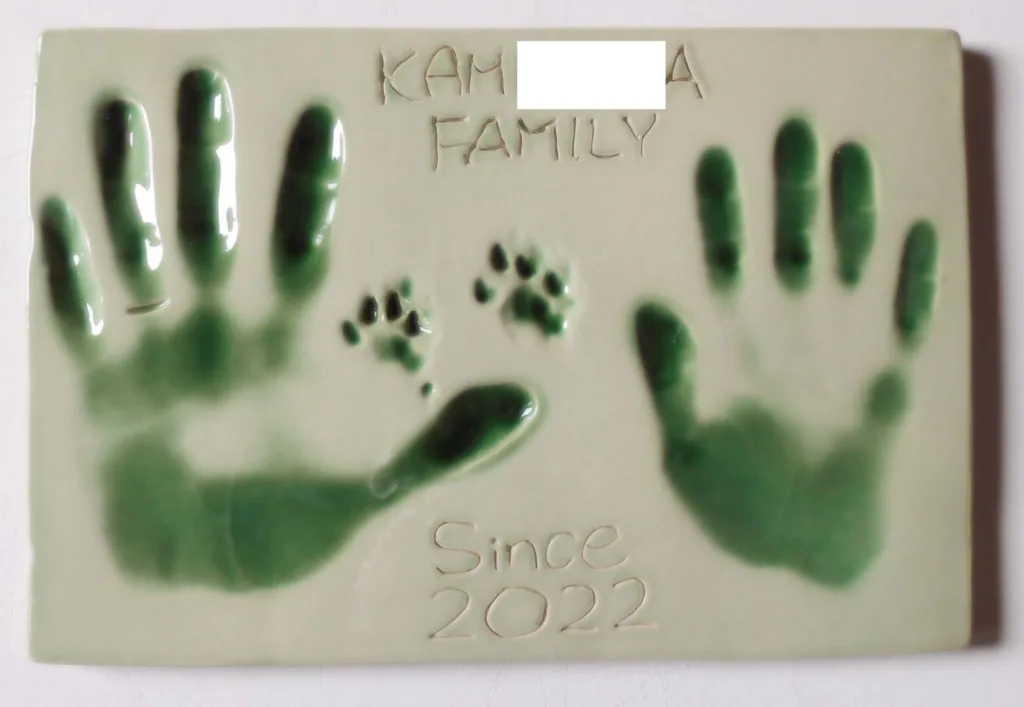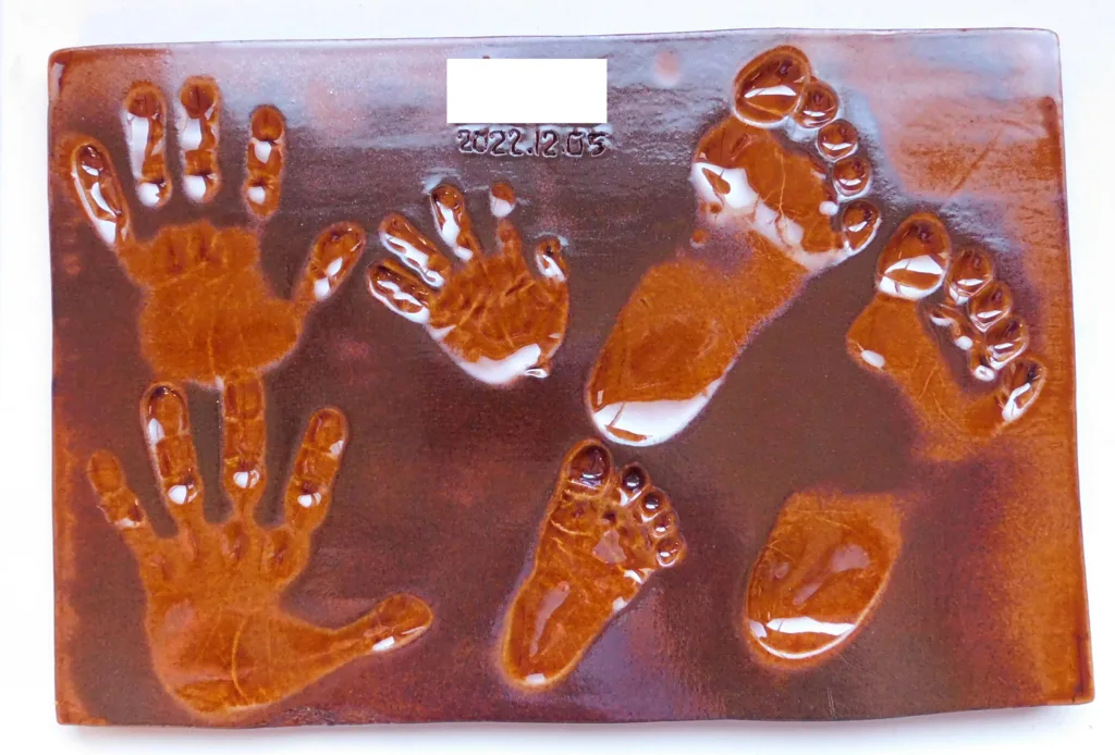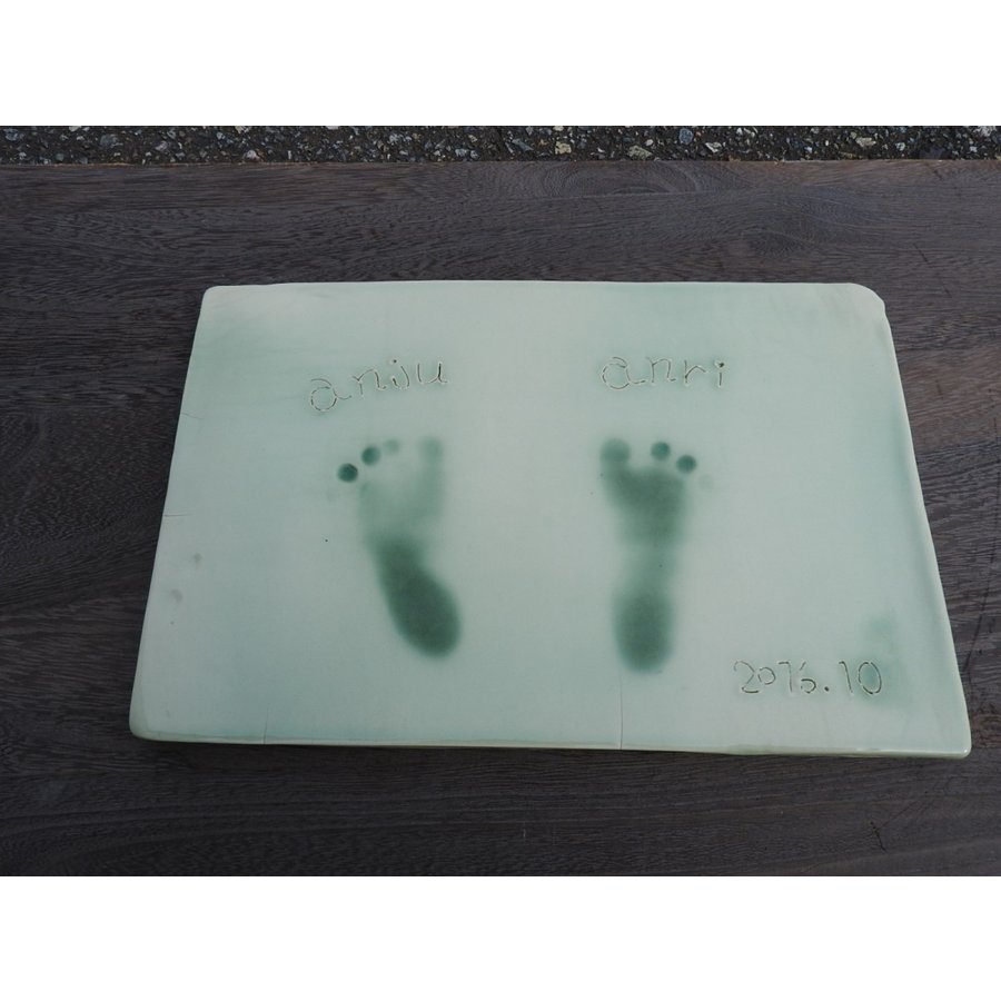 粘土にぎゅうっと力強く押さえ込んだ手形、足形をそのまま陶板に焼き上げるサービスです。
