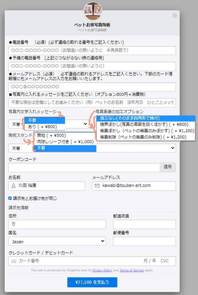 1.買い物かごから、ご注文ペットお骨写真陶板 本体価格25000円+消費税