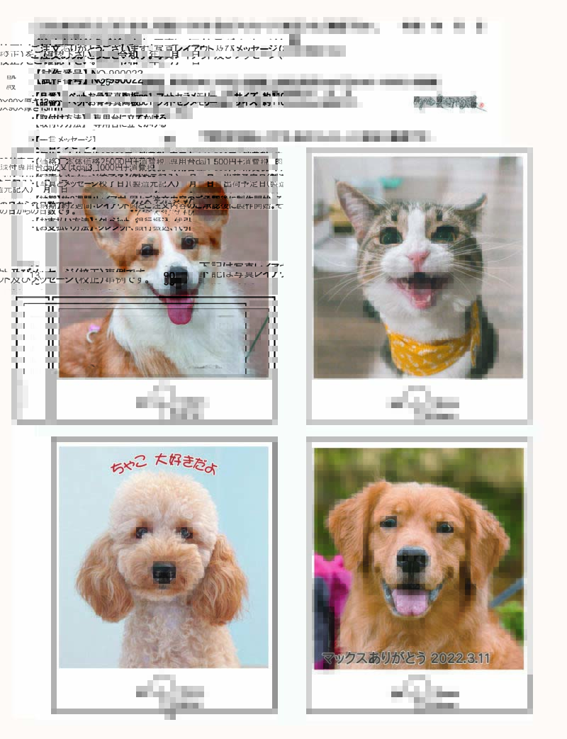 | 写真画像の加工オプションと料金 境界ぼかし(写真の周囲を白くぼかす) 800円+消費税 背景ぼかし(ペットの背景のみぼかす) 1,200円+消費税 背景削除(ペットの背景のみ削除) 1,200円+消費税 |