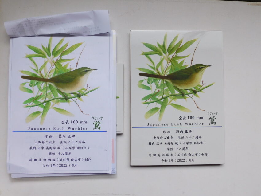 左側に見えるのは、繊細なタッチで描かれた「鶯(うぐいす)」の図鑑用原画です。羽の一枚一枚、そして植物のしなやかな葉まで、まるで本物が目の前にいるかのように精密に描かれています。日本の春を象徴する鶯が、自然の中で生き生きと描かれていて、見ているだけで癒されますよね。