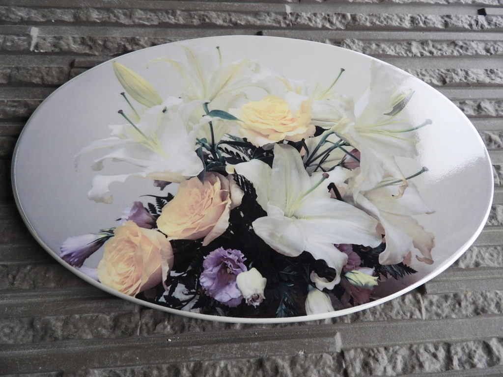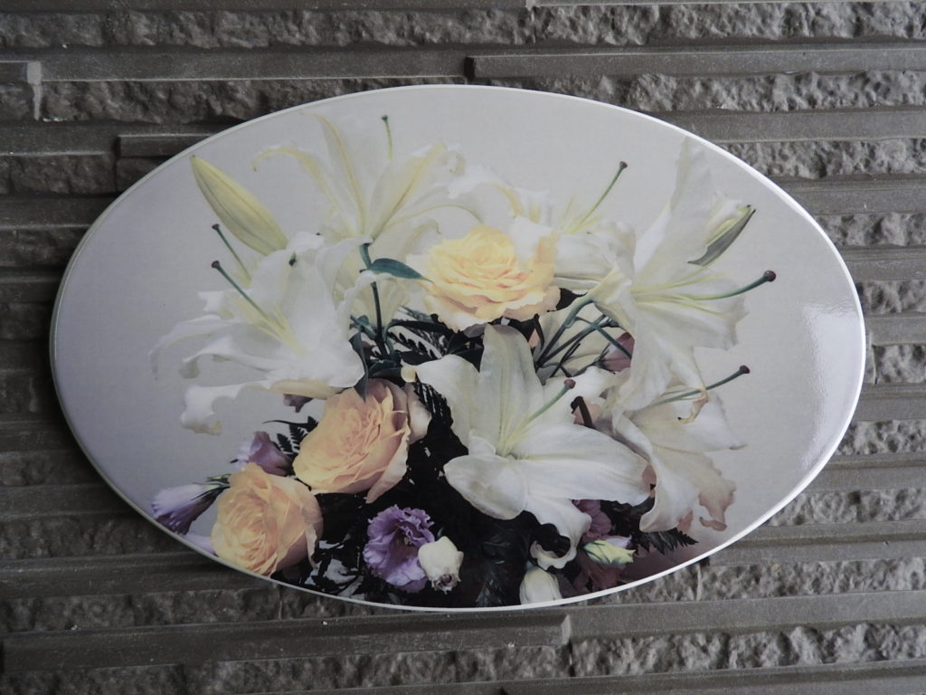 墓石に貼り付けるために、亡くなられた方が生前好きだったバラとカサブランカの花を写真陶板にして手作りの楕円形陶板に焼き上げました。