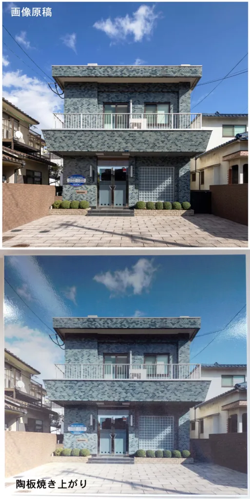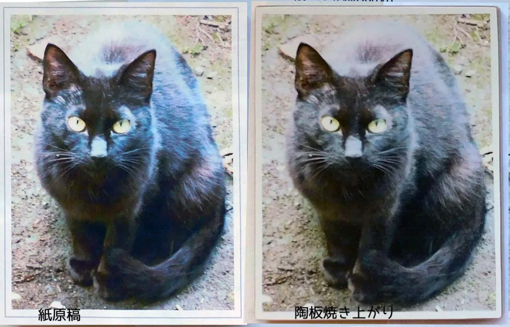 左が原稿データ、右が磁器質タイルに焼付ました。